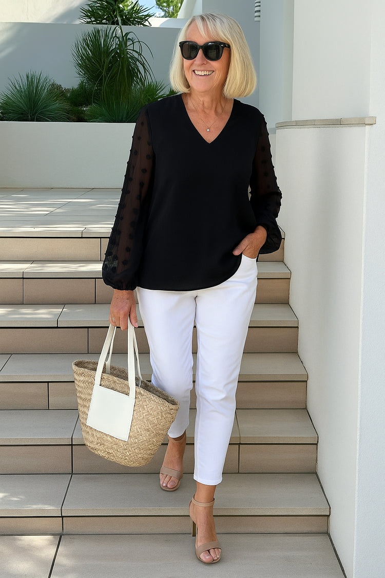 • Style: Relaxed V-neck blouse with textured semi-sheer sleeves