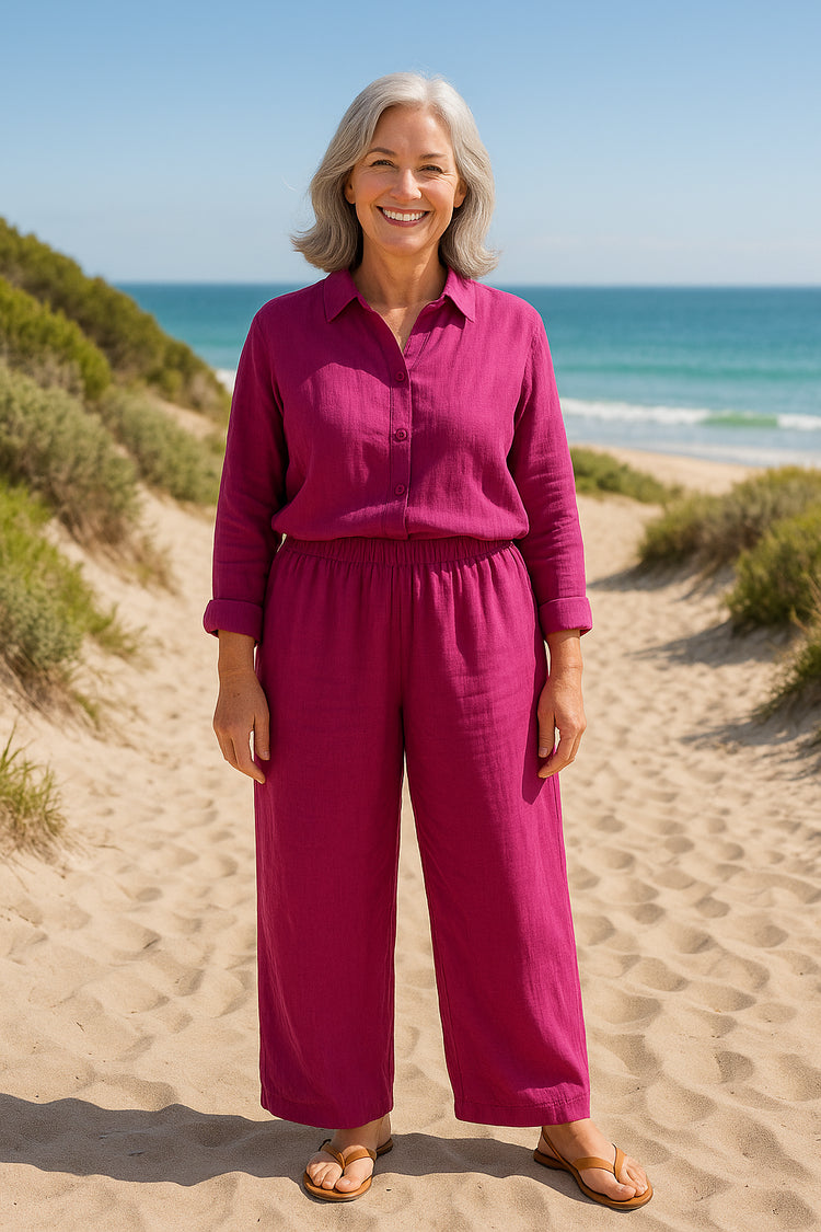 A breezy, feel-good fit that flatters without clinging. Crafted from a soft linen-cotton blend, they’re breathable, naturally lightweight, and gentle on the skin.